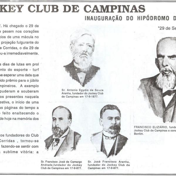 Antonio Egydio de Souza Aranha seria o fundador do Jockey Club de Campinas.No dia 1º de setembro de 1878, Luís Antonio de Pontes Barbosa era eleito o primeiro presidente do Clube de Corridas, tendo sido sucedido por pessoas ilustres como Manuel Ferraz de Campos Salles.